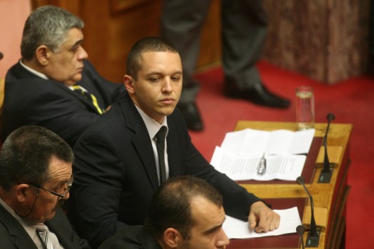 - Όρθιοι με εντολή Κασιδιάρη οι βουλευτές της Χρυσής Αυγής καθώς ο αρχηγός τους πήγαινε στο βήμα