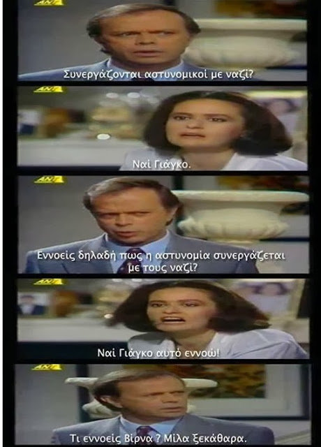 Συγκεκριμένα, η εισαγγελέας Βίρνα Δράκου φέρεται να αποκαλύπτει οργισμένη στον έκπληκτο και καχύποπτο Γιάγκο Δράκο πως η αστυνομία συνεργάζεται με τους ναζί. Διάλογος απολαυστικός με τον Γιάγκο Δράγκο να επιμένει μέχρι τέλους «Τί εννοείς Βίρνα, μίλα ξεκάθαρα».