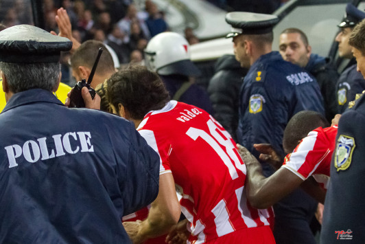 Για το θέμα του Μανιάτη και τις κατηγορίες ότι χτυπήθηκε ο παίκτης του Ολυμπιακού, η πλευρά του ΠΑΟΚ απάντησε ότι ο παίκτης του Ολυμπιακού μετά την αποβολή του έφυγε γρήγορα για τη φυσούνα και εκεί τον σταμάτησαν δύο άνδρες ασφαλείας του ΠΑΟΚ, αλλά και δύο του Ολυμπιακού, χωρίς κανένας να τον χτυπήσει. Εκεί, πρόσθεσε ο Ζήσης Βρύζας ότι αν κάποιος από τους άνδρες ιδιωτικής ασφάλειας που συνεργάζεται η ΠΑΕ ΠΑΟΚ χτυπούσε κάποιον παίκτη, τότε θα είχαμε σταματήσει τη συνεργασία μαζί τους.