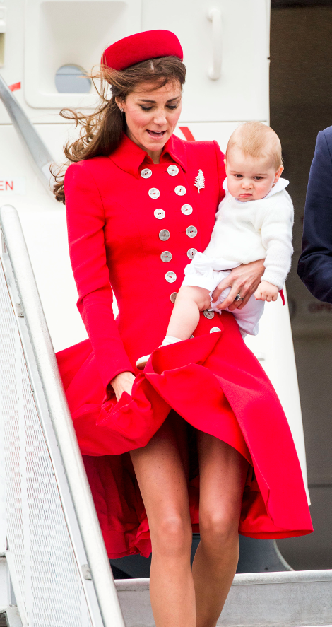 Και η αποκάλυψη των οπισθίων της στην περιοδεία της σε Αυστραλία και Νέα Ζηλανδία δεν ήταν το μόνο στιλιστικό ατύχημα. Παραλίγο να συμβεί το ίδιο την πρώτη ημέρα του ταξιδιού. Την ώρα που η δούκισσα του Κέιμπριτζ έβγαινε από το αεροπλάνο φορώντας ένα... αεράτο κόκκινο φόρεμα και κρατώντας στα χέρια τον τρίτο διάδοχο του βρετανικού θρόνου, ο αέρας της σήκωσε ξανά το φουστάνι αποκαλύπτοντας τα πόδια της. Λίγο ακόμη και θα βλέπαμε και το εσώρουχό της.