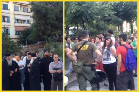 Συμμετέχοντες στο Thessaloniki Pride έφτασαν το απόγευμα στον Ιερό Ναό του ΑγίουΔημητρίου, όπου ήταν σε εξέλιξη διαμαρτυρία μελών θρησκευτικών οργανώσεων εναντίον του Φεστιβάλ Υπερηφάνειας.