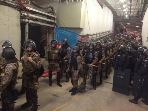 Συγκλονιστικές είναι οι εικόνες που κάνουν το γύρο του κόσμου μέσω twitter και δείχνουν πάνοπλους αστυνομικούς να έχουν μπει στο στάδιο Μινεράο του Μπέλο Οριζόντε πριν τελειώσει ο ημιτελικός Βραζιλίας – Γερμανίας για να είναι έτοιμοι να επέμβουν σε περίπτωση που στις εξέδρες ξεσπάσουν επεισόδια.