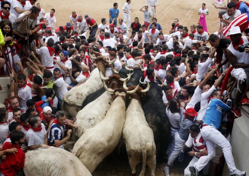 Μία ανεξέλεγκτη αναστάτωση δημιουργήθηκε στο στενό εκείνο σημείο την ώρα που δύο από τους ταύρους που συμμετείχαν στο «ενθιέρρο» (κλειστή διαδρομή) εφόρμησαν πάνω στο πυκνό πλήθος, καταπατώντας ορισμένους από τους δρομείς.